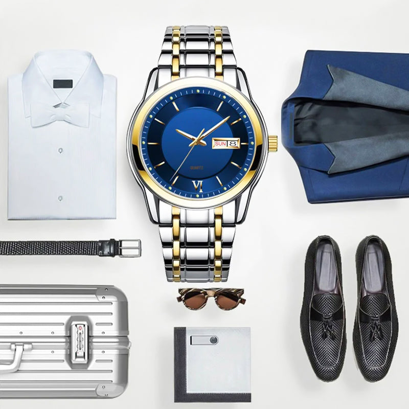 Classic Men's Watch - This men's ultra-thin waterproof quartz watch with dual calendar window features a classic silver/gold watch design, coated glass mirror and stainless steel case and strap. The stainless steel strap makes the watch durable and comfortable to wear. The watch also features a foldable buckle for maximum comfort and safety.